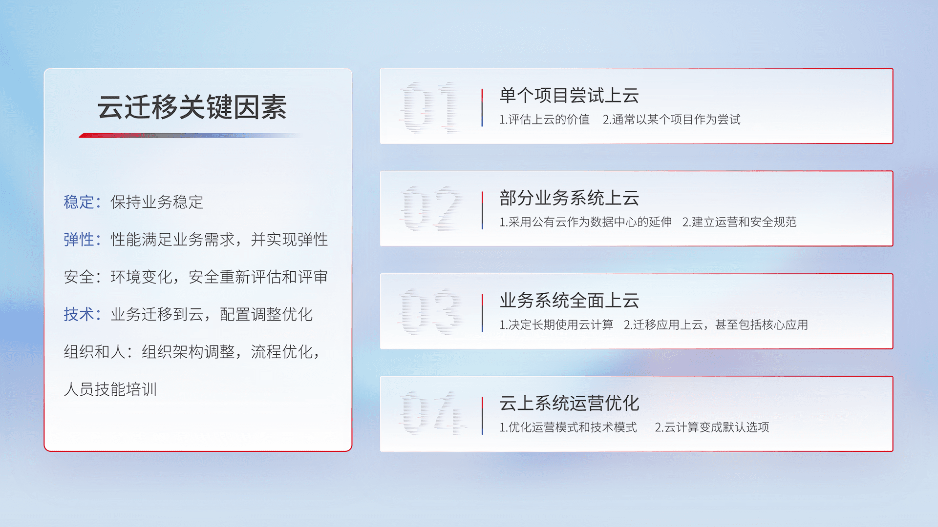 结合实际业务,,,,从规划设计、、、、云平台选型、、、、云原生改造、、、、数据迁移、、集成交付,,迁移全过程为客户识别最佳上云路径,,,做好风险识别管理,,,,设计网络架构、、身份权限、、、、安全审计合规、、、、操作审计、、、日志审计、、、、监控告警策略、、多站点容灾设计等,,对云上基础设施进行整体规划,,提升IT治理水平,,以满足弹性、、、、高可用、、高性能的需求。。。